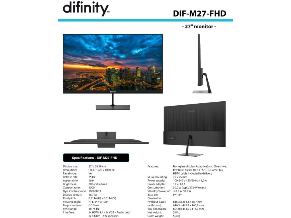Difinity 27 Zoll Monitor, Full-HD 1920x1080, Schwarz